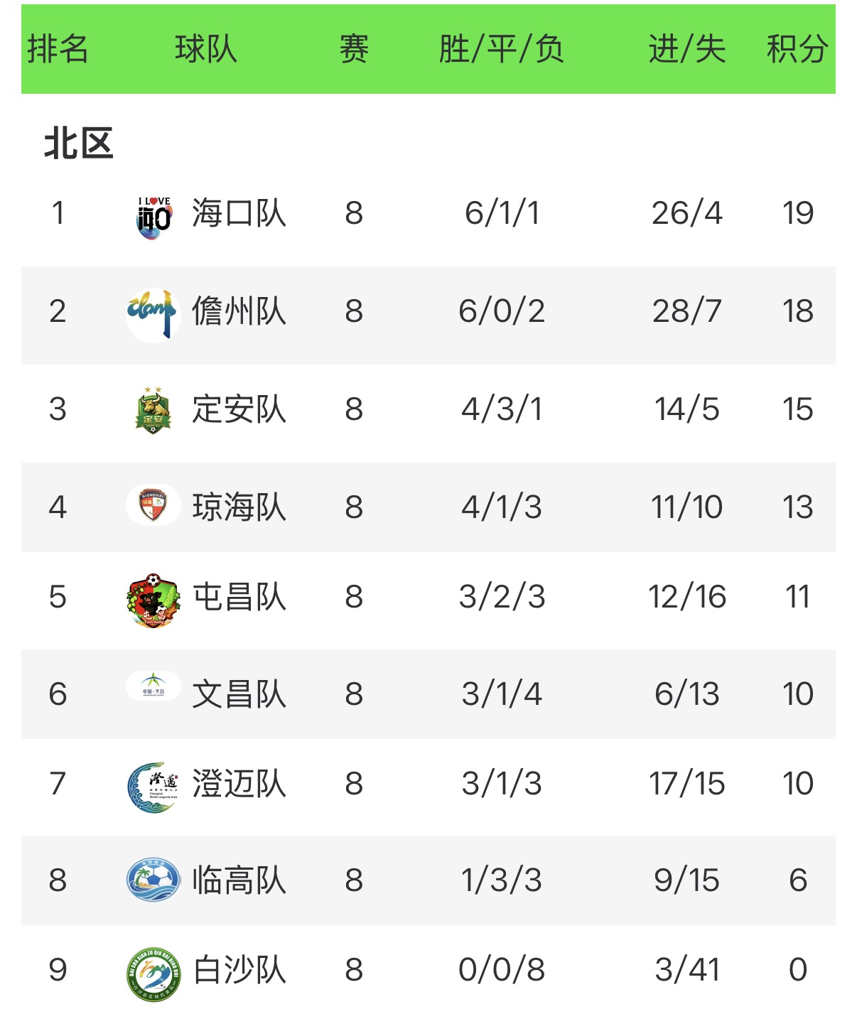 常规赛末轮,北区竞争尤为激烈。海口队3:1击败琼海队,以6胜1平1负积19分的成绩锁定北区第一。儋州队6:0大胜澄迈队,以6胜2负积18分排名第二。定安队2:0战胜文昌队,以4胜3平1负积15分位列第三。随着屯昌队与临高队1:1战平,两队均无缘八强。琼海队虽然最后一轮失利,但仍凭借4胜1平3负积13分的成绩位居北区第四,获得最后一个晋级席位。