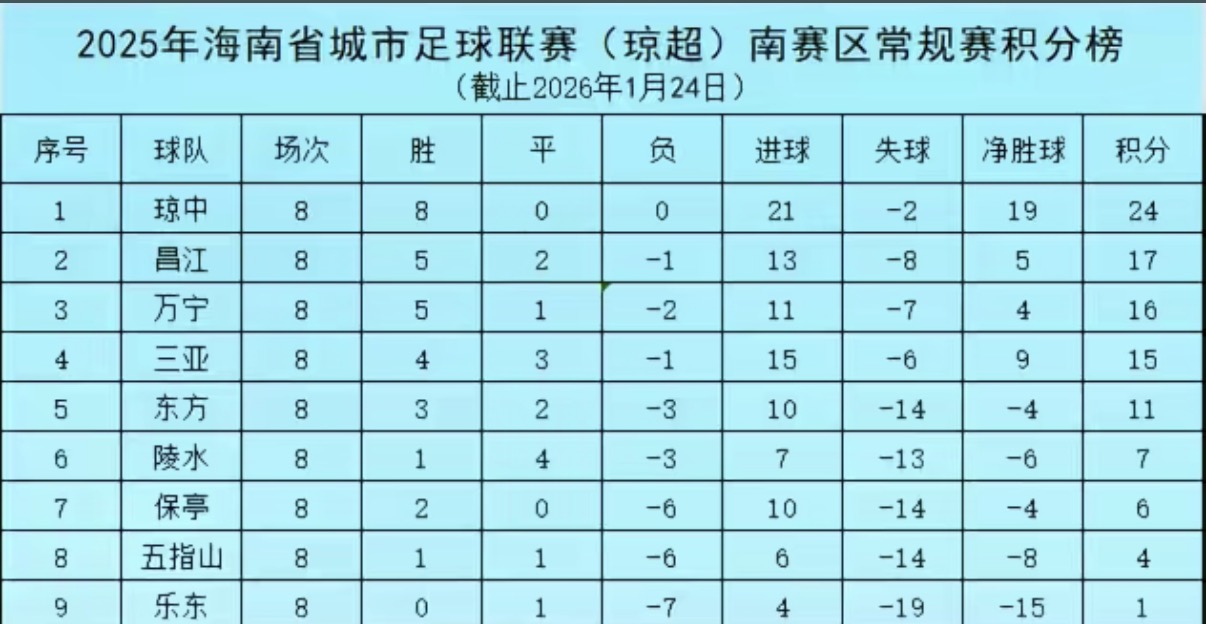 南区方面,琼中队主场2:1力克昌江队,成为常规赛八轮比赛中唯一保持全胜的球队,积24分高居南区榜首。昌江队以5胜2平1负积17分排名第二。万宁队客场1:0小胜陵水队,以5胜1平2负积16分位列第三。三亚队在一场进球大战中3:2险胜保亭队,以4胜3平1负获得南区第四名。另一场比赛,五指山队4:2战胜乐东队。